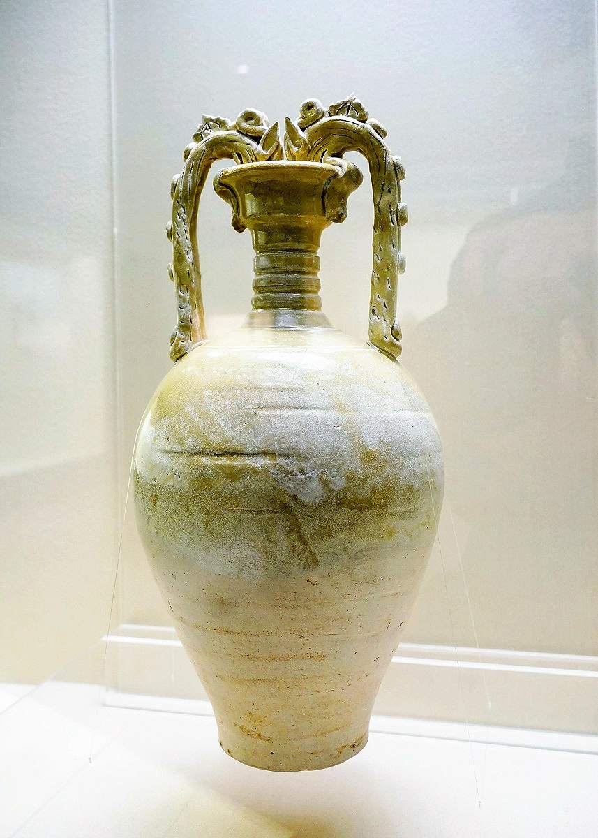 The jars displayed in the Color and Shape section exhibit an aesthetic sense of the cultural interchanges that were happening in Eurasia. Produced in China in the 7th or 8th century, “White Glazed Vase with Dragon-shaped Handles” features a long, narrow neck and two handles resembling dragons. Its shape is similar to an ancient Greek amphora. Researchers believe that amphora made in the West were carried to China, where local potters integrated Eastern cultural designs into their work, producing vases such as this one with dragon-shaped handles.
