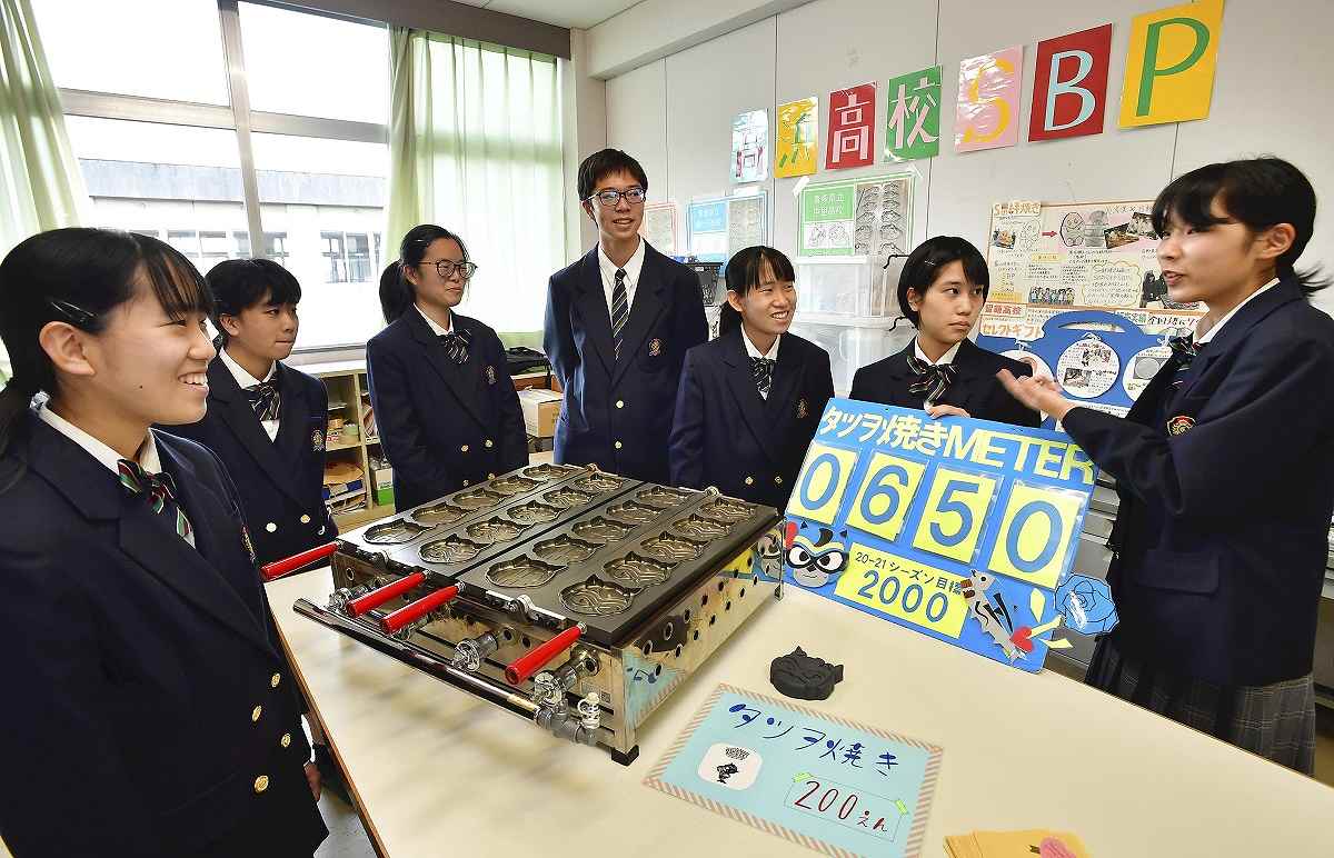 The social business project (SBP) team at Takahama High School earns money by selling anko bean paste-filled cakes baked in the shape of the local B.League basketball team’s mascot. The aluminum mold used to bake the confection was made by automotive engineers utilizing an original clay mold created by an onigawara craftsperson.