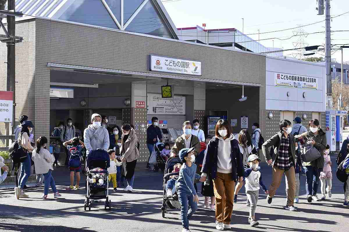 Parents and children emerge from Kodomonokuni Station.