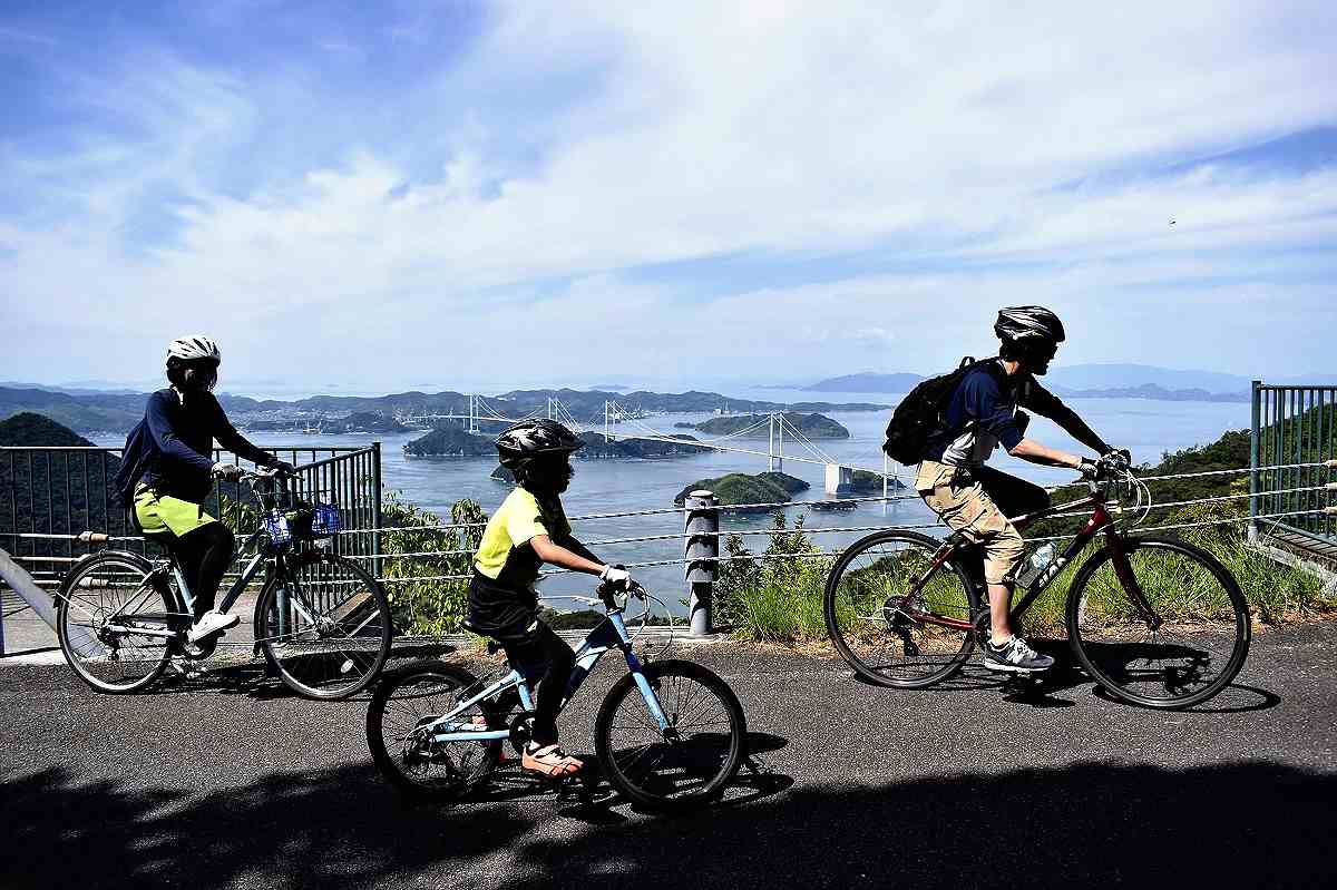 A family cycles along the Shimanami Kaido Cycling Road in Imabari, Ehime Prefecture.