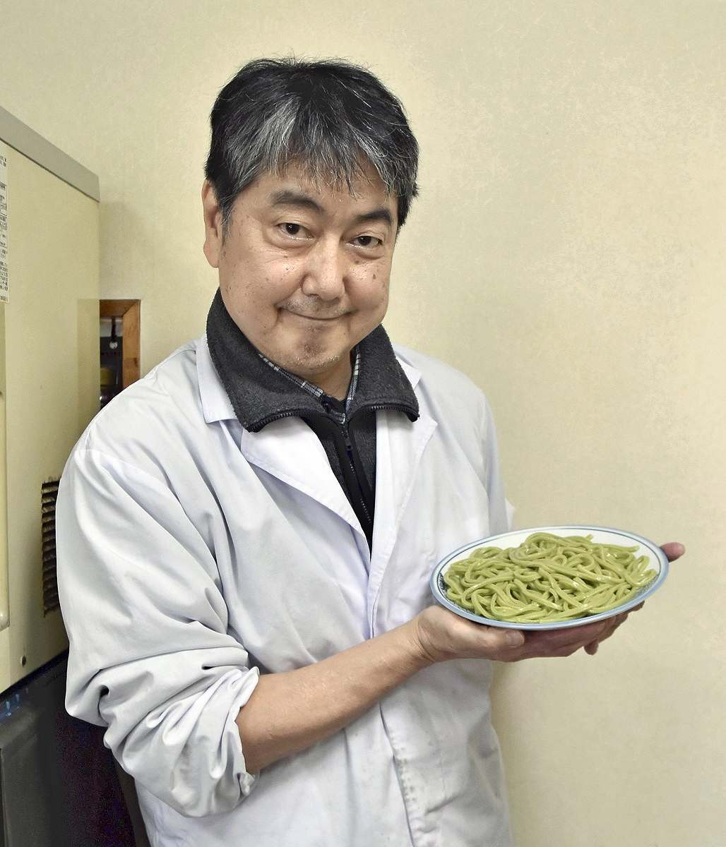 Shigekazu Tomii, owner of the noodle restaurant Choju-an, poses with komatsuna udon.