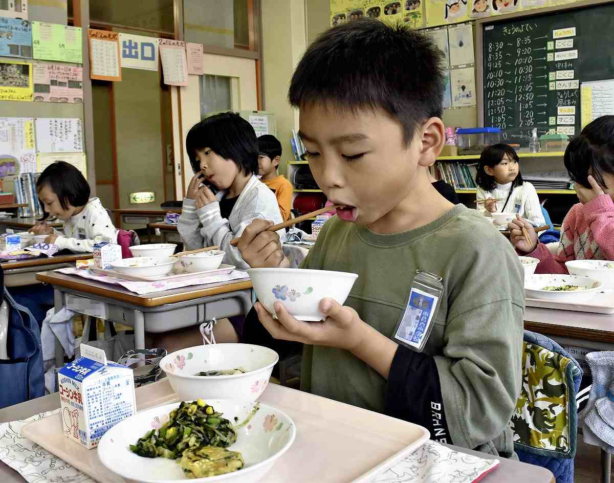 Students at Minami-Kasai Elementary School in Edogawa Ward, Tokyo, enjoy their school lunch made with komatsuna.