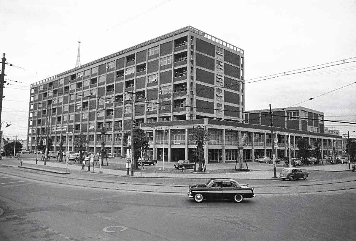 In 1959, Yokohama commemorated the centennial of the port’s opening, and the seventh one was built in the Minatocho area again as a commemorative project. The building was designed with thick-tiled walls and irregularly lined windows and terraces. The bare concrete pillars become thinner as they go up, and inside the building looks like a theater stage. Although its appearance is simpler, the design is more detail-oriented.