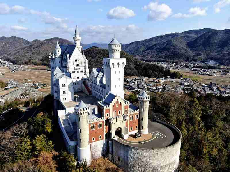 The park’s most magnificent attraction is probably the 45-meter-high, seven-storied Swan Castle (called Hakucho-jo in Japanese), which was designed based on Germany’s Neuschwanstein Castle. Monguchi himself visited the German castle many times and obtained its blueprints prior to the construction of his castle, which was completed in 2009 atop a mountain roughly 110 meters above sea level. The total construction cost was about ¥4 billion.