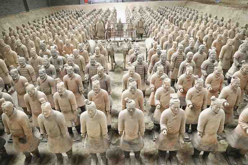Replicas of China’s terracotta warrior statues are seen, each bearing a unique expression.