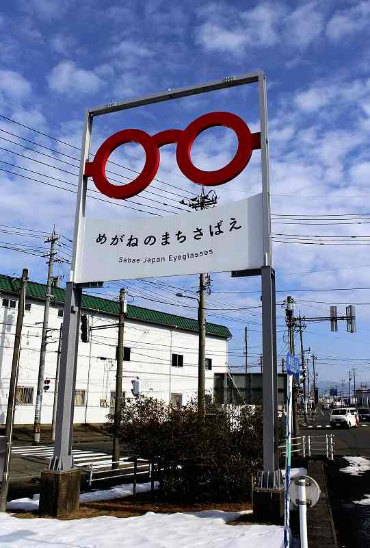 A billboard with red glasses is seen in Sabae, promoting the “city of glasses.”