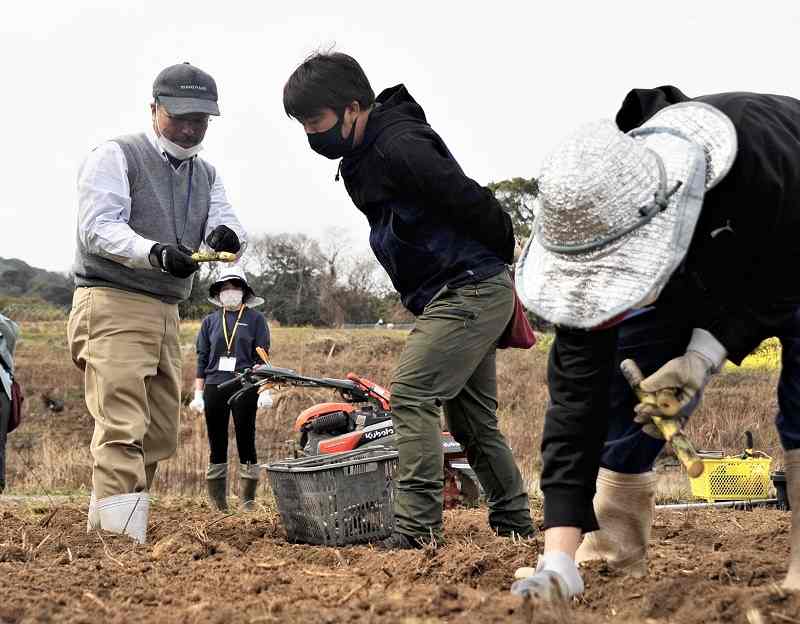 Keisho Tsunematsu, center, a member of a local farmers group, plants sugarcane in a field in Beppu, Oita Prefecture.