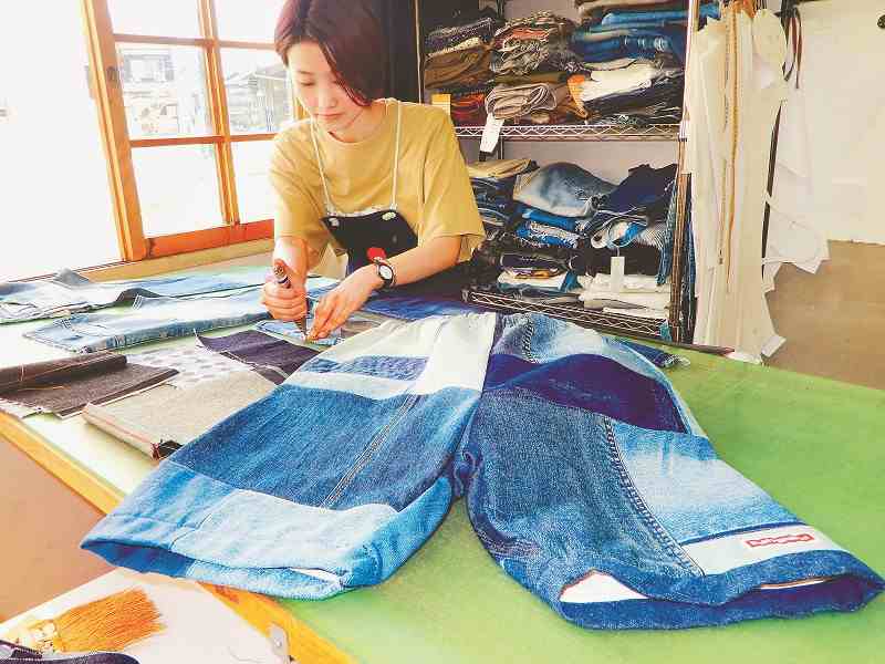 Betty Smith Co., an apparel manufacturer in the Kojima district in Kurashiki, is popular for its products made by recycling scraps from the jeans manufacturing process. Colorful patchwork-like pants are created by cutting denim fabrics of different colors and sizes and then sewing them together.