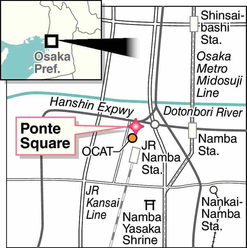 Ponte Square is directly connected to JR Namba Station. For subway users, it is about a 5-minute walk through the underground passage from Namba Station on the Osaka Subway Midosuji Line. For those using Hanshin or Kintetsu railways, it is about a 2-minute walk from Osaka Namba Station. By car, it is close to the Minatomachi exit of the Hanshin Expressway.