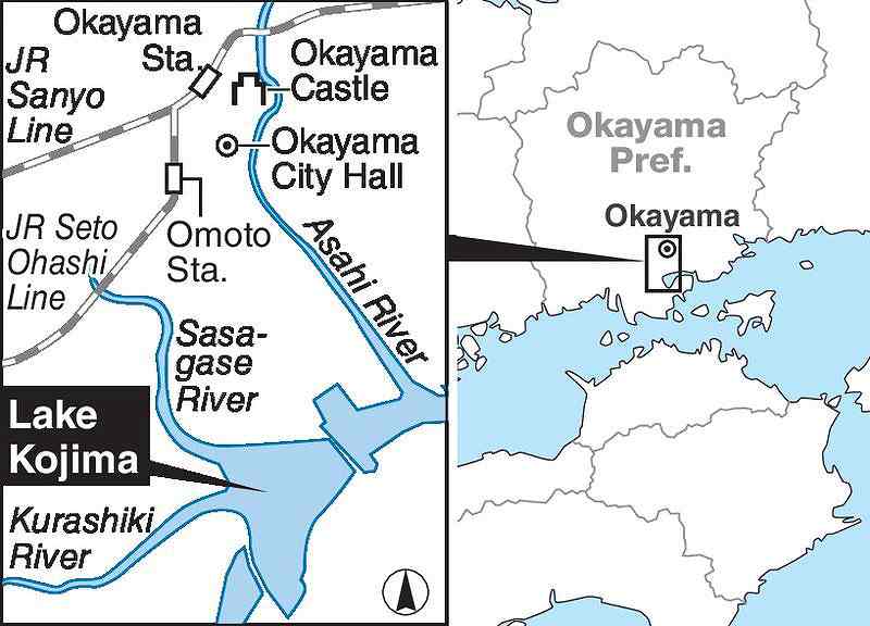 Lake Kojima, which straddles Okayama and Tamano cities, has an area of 10.88 square kilometers and was created to secure water for agriculture in 1959 by damming Kojima Bay and desalinating it.