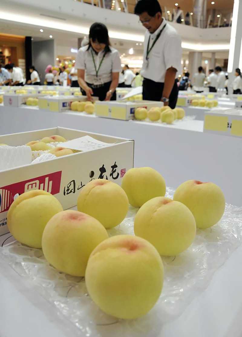 Peaches are seen at a fair in Okayama in 2015.