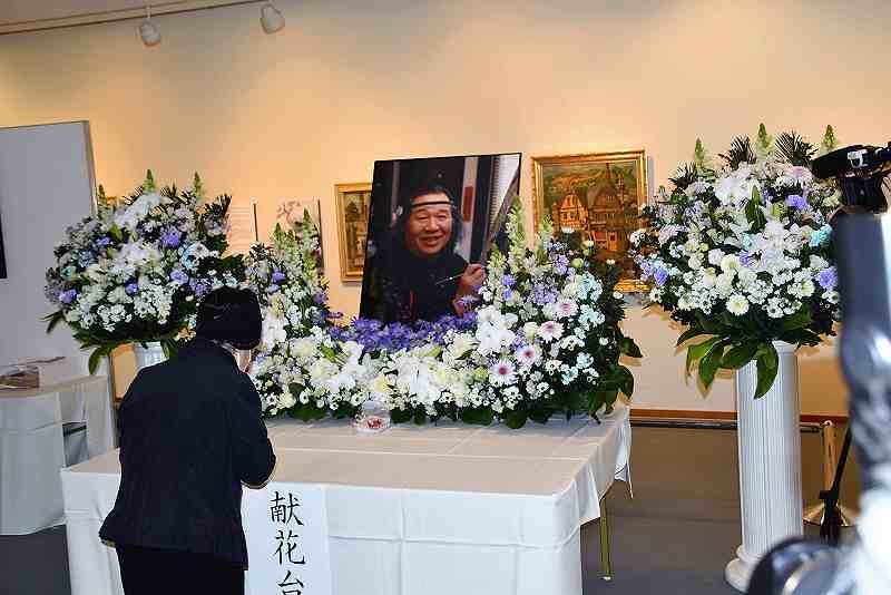 SUWA, Nagano — Mourners prayed for the soul of late painter Taizi Harada in front of an altar and set up for floral tributes at the Taizi Harada Art Museum in Suwa, Nagano Prefecture, on March 8.
