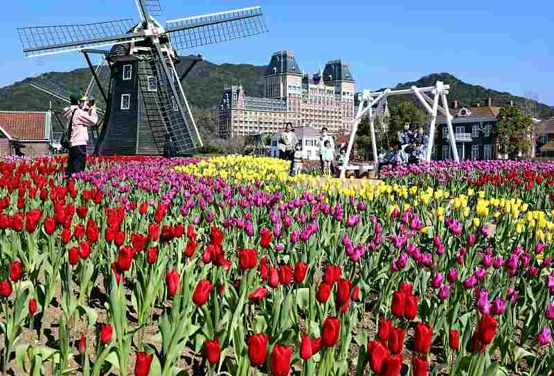 Colorful tulips are in full bloom at Huis Ten Bosch in February.