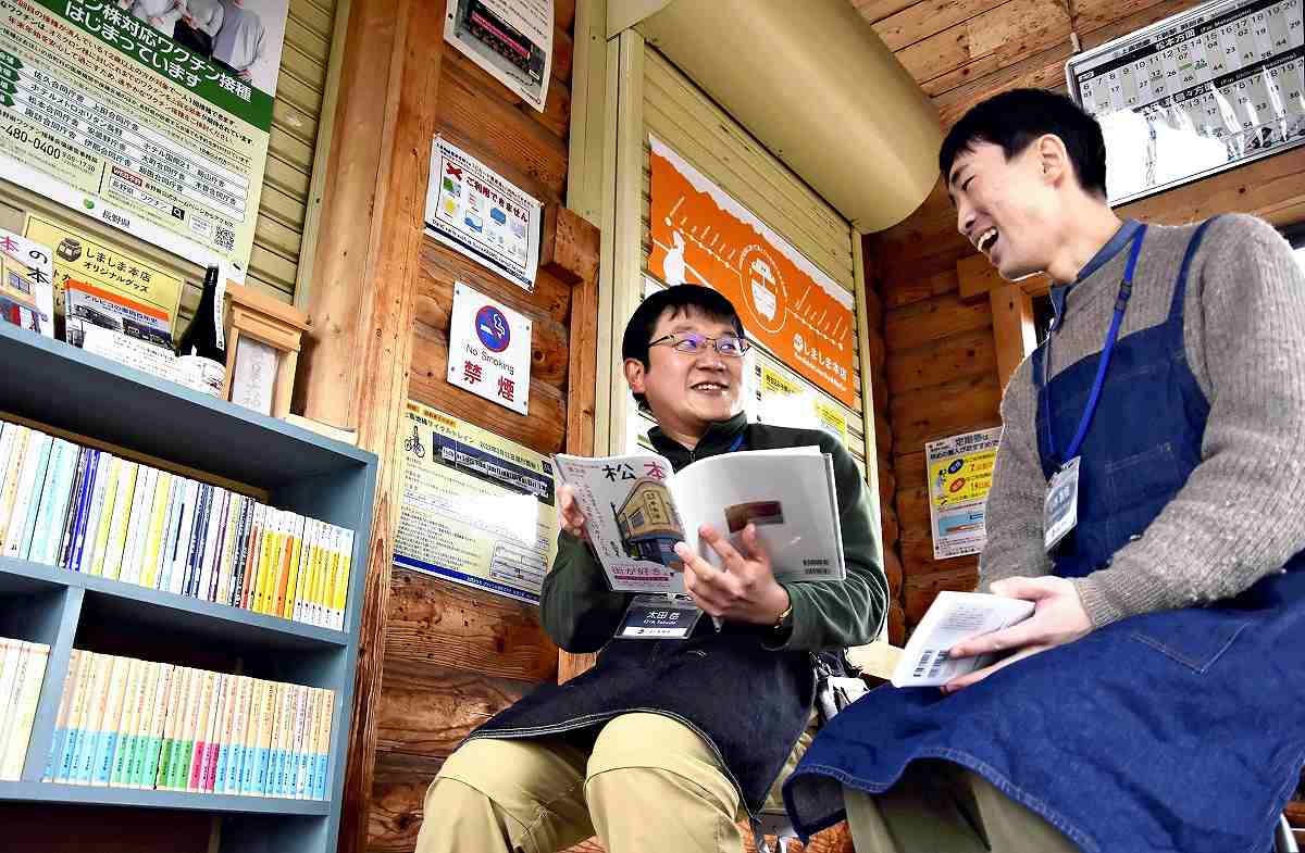 Takeshi Ota, left, talks with Tomoki Kobayashi beside a bookshelf installed in Shimonii Station in Matsumoto, Nagano Prefecture, on Nov. 20.