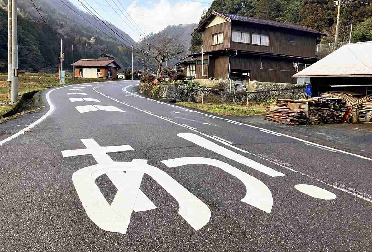 A road marking that reads “Oh!” is seen on a prefectural road in Yoshika, Shimane Prefecture.