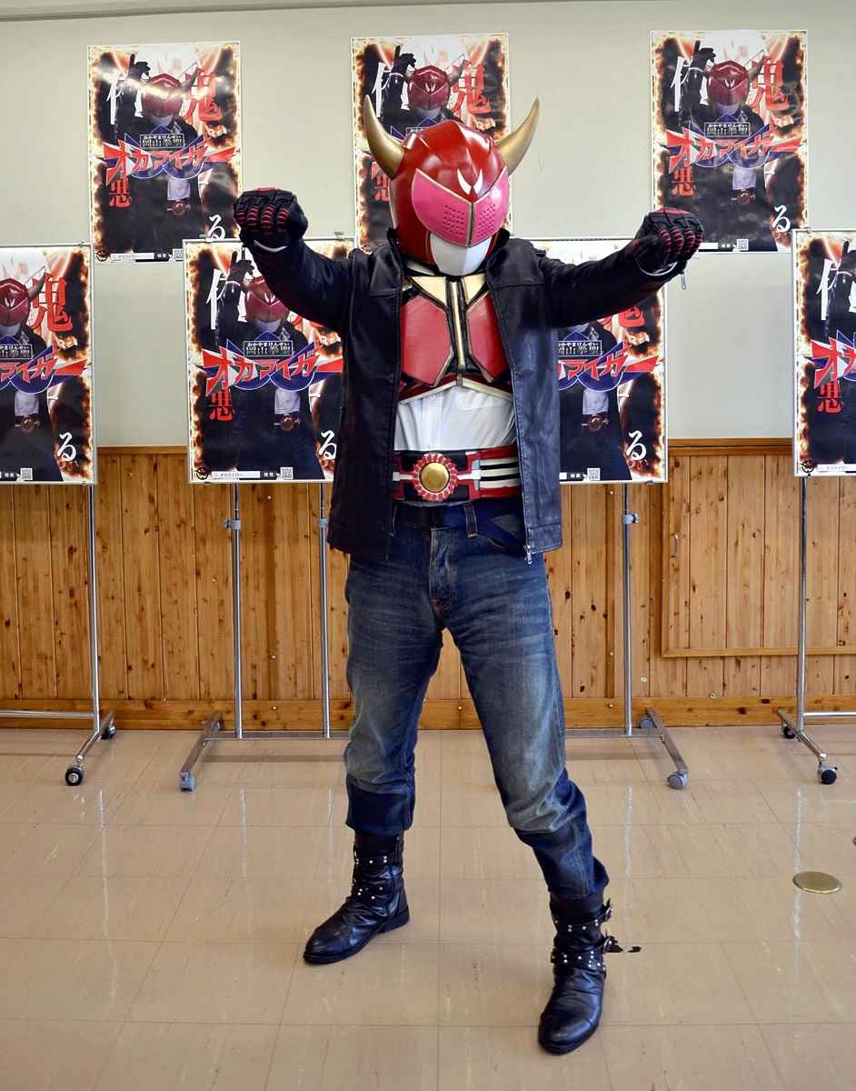 Oka-Liger raises his fists, vowing to protect the lives of local residents, at the Okayama prefectural government building.