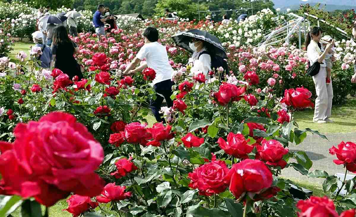 People enjoy roses at Echigo Hillside Park in Nagaoka, Niigata Prefecture, on May 27.