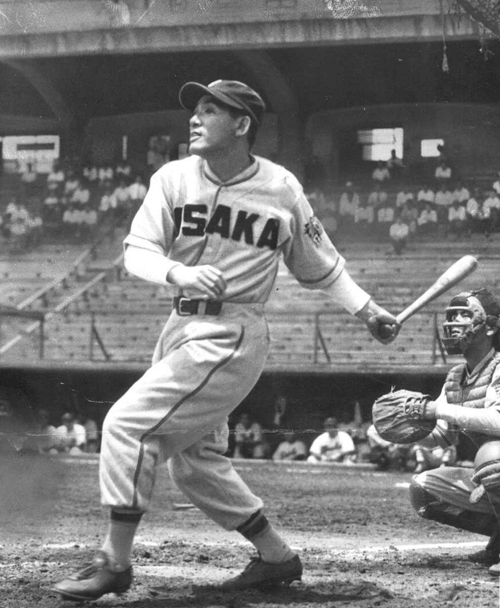 Slugger Fumio Fujimura hits in his Osaka Tigers uniform in 1950.
