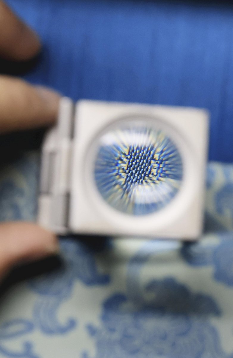 Details of a woven cloth are seen through a magnifying glass.