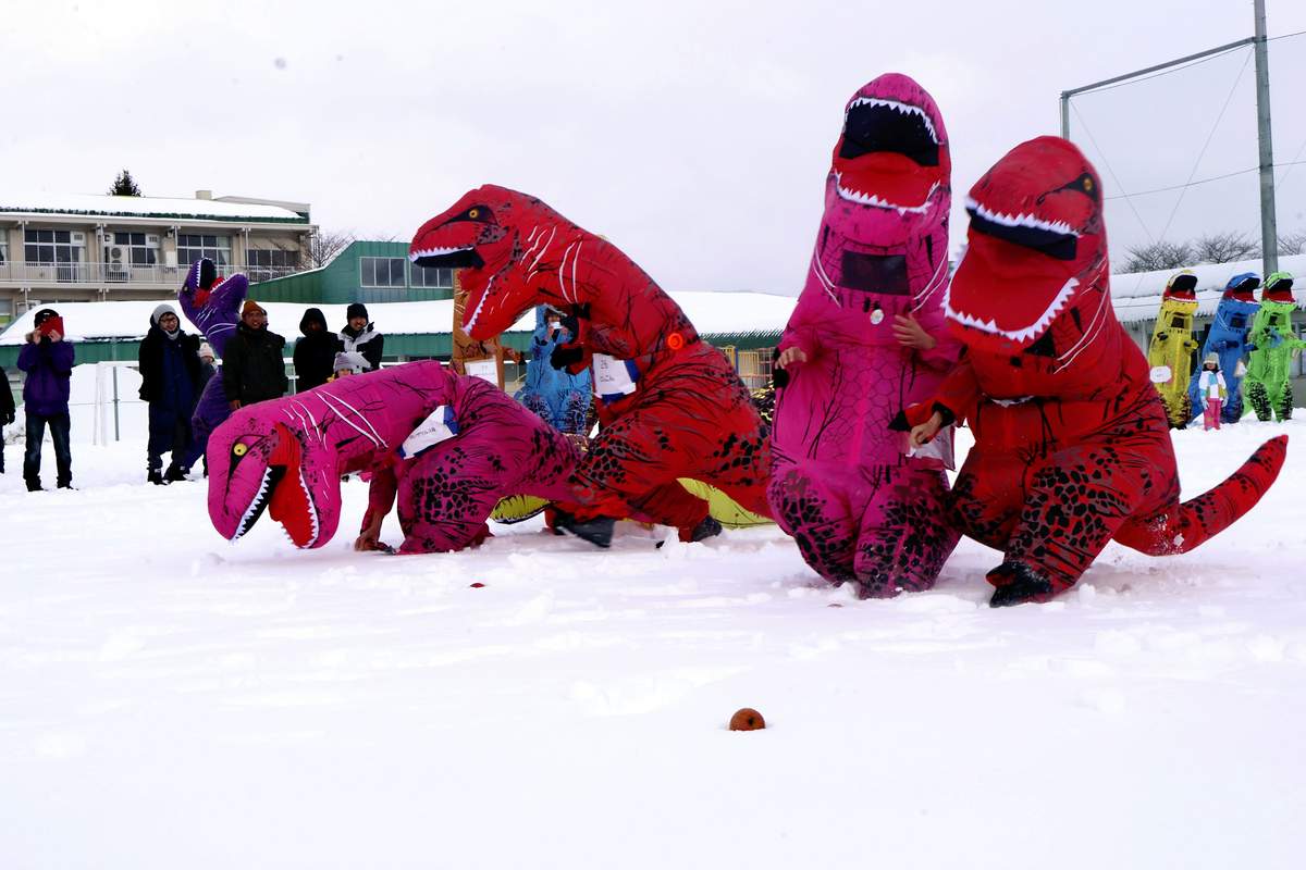 Participants in the adult categories ran a nearly 50-meter course, picking up apples, a local specialty, along the way. Sometimes bogged down by snow, the “dinosaurs” struggled to move their legs and short arms. With heads bobbing and tails waving, they charged on through the snow.