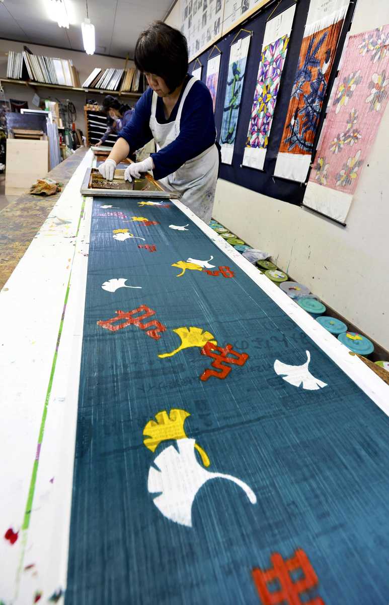 Kyoko Henmi dyes silk fabrics using a stencil at a facility where visitors can experience the fabric production process.