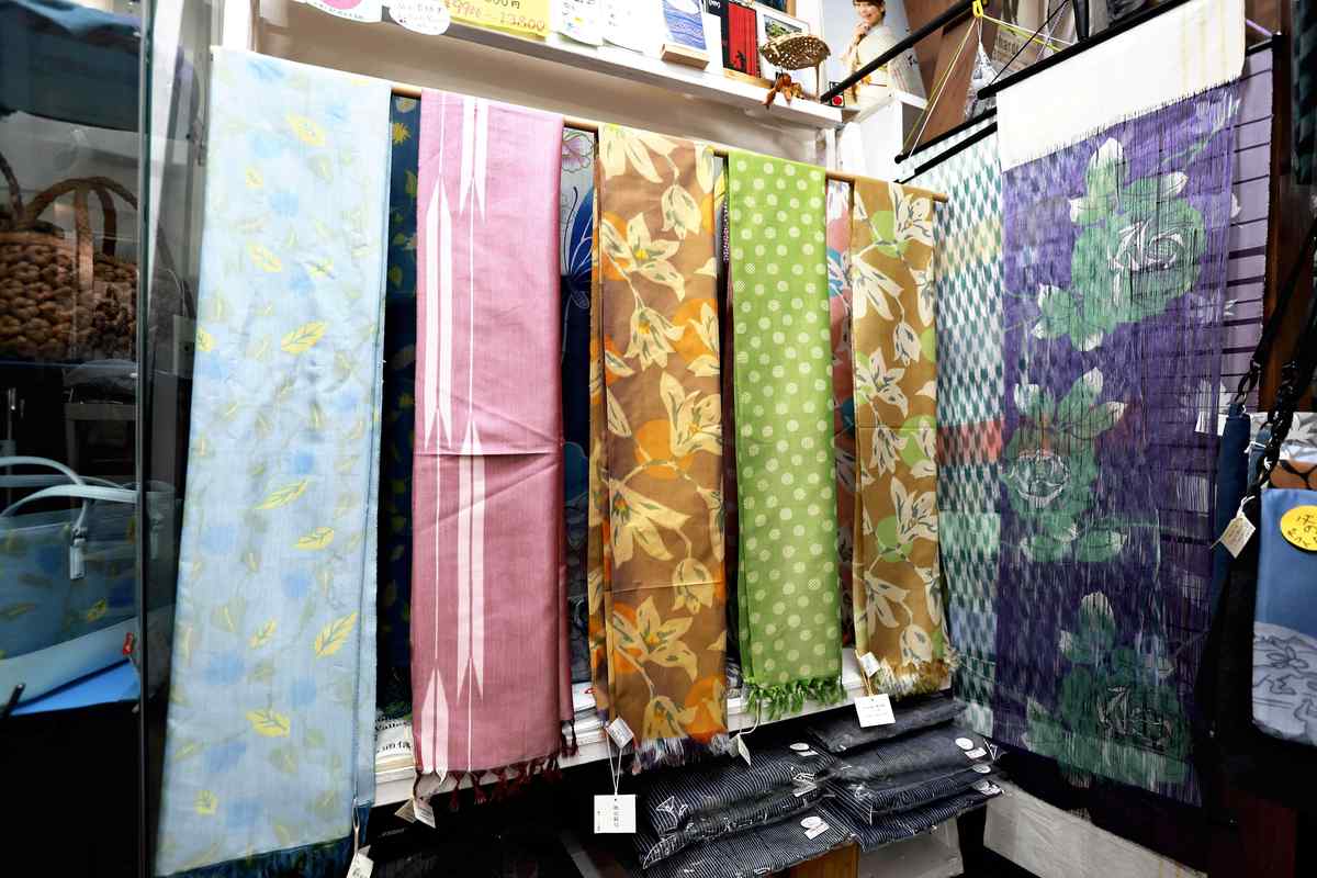 These fabrics are made with a technique called “hogushi nassen,” in which warp threads are temporarily woven together and dyed using stencils. Because the threads, not the finished fabrics, are dyed, both the front and back sides have the same coloration. This makes it possible for the clothes to be worn for a long time, contributing to their popularity.