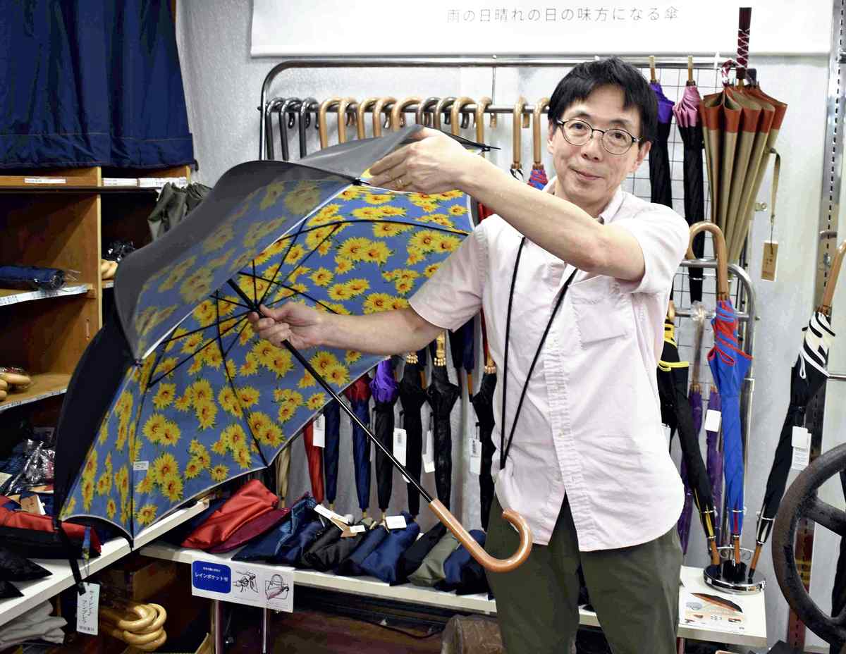 Hirofumi Kawaguchi shows a Silent Umbrella at Maruyasu Yougasa in Abeno Ward, Osaka.