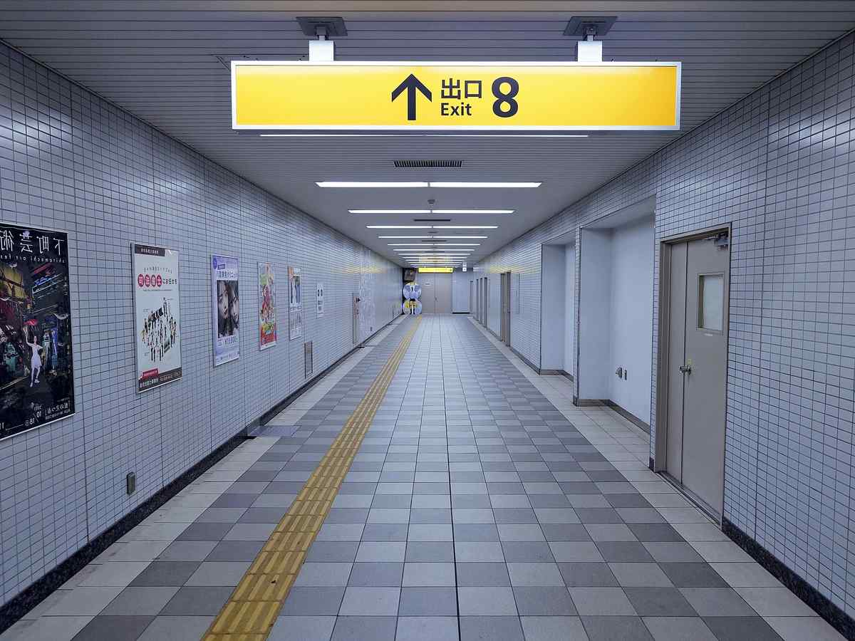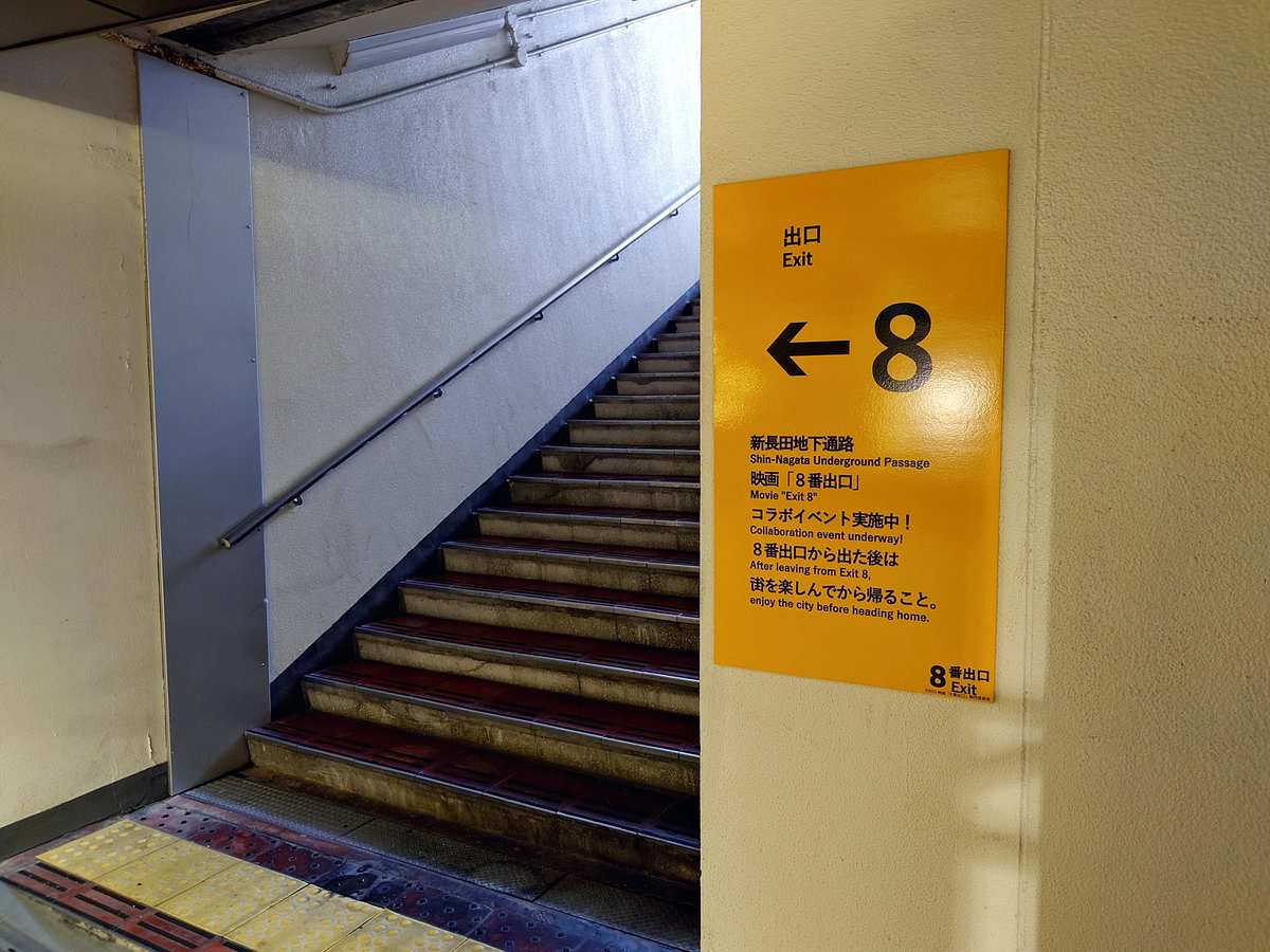 The underground passageway at Shin-Nagata Station on the Kobe Municipal Subway’s Kaigan line is supposed to have exits 1, 2, 3 and 4, but recently, an “Exit 8” has appeared, allowing people to go above ground from the exit.