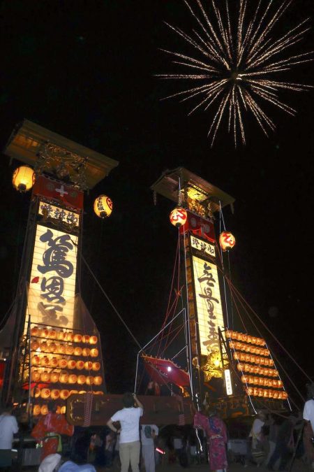 The four floats departed from the Jike fishing port at around 7 p.m. As fireworks were set off to signal the start of the procession, cheers erupted from participants and spectators. The floats set out for the district, while accompanied by the sounds of taiko drums and flutes.