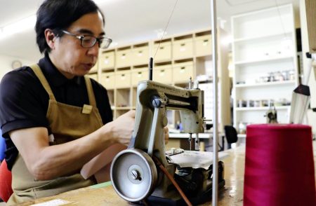 Ishiyama has continued to use and maintain the very old sewing machines, which were manufactured around the middle of the 20th century. Other old tools are also essential for the work, including wooden frames for cutting cloth into triangular shapes.