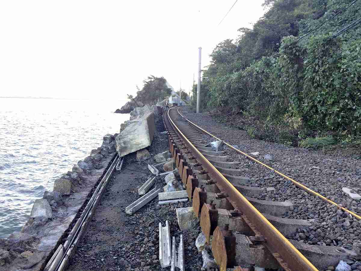 Typhoon No. 18, which made landfall in Shikoku in September 2017, brought a storm surge and waves that damaged an about 800-meter-long seawall between the two stations, causing it to shift in some places and collapse in others.