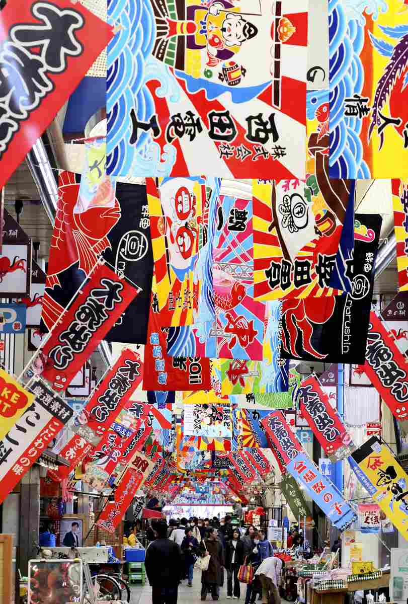 People walk under fishermen’s flags at the Uontana shopping arcade in Akashi, Hyogo Prefecture, on Dec. 4