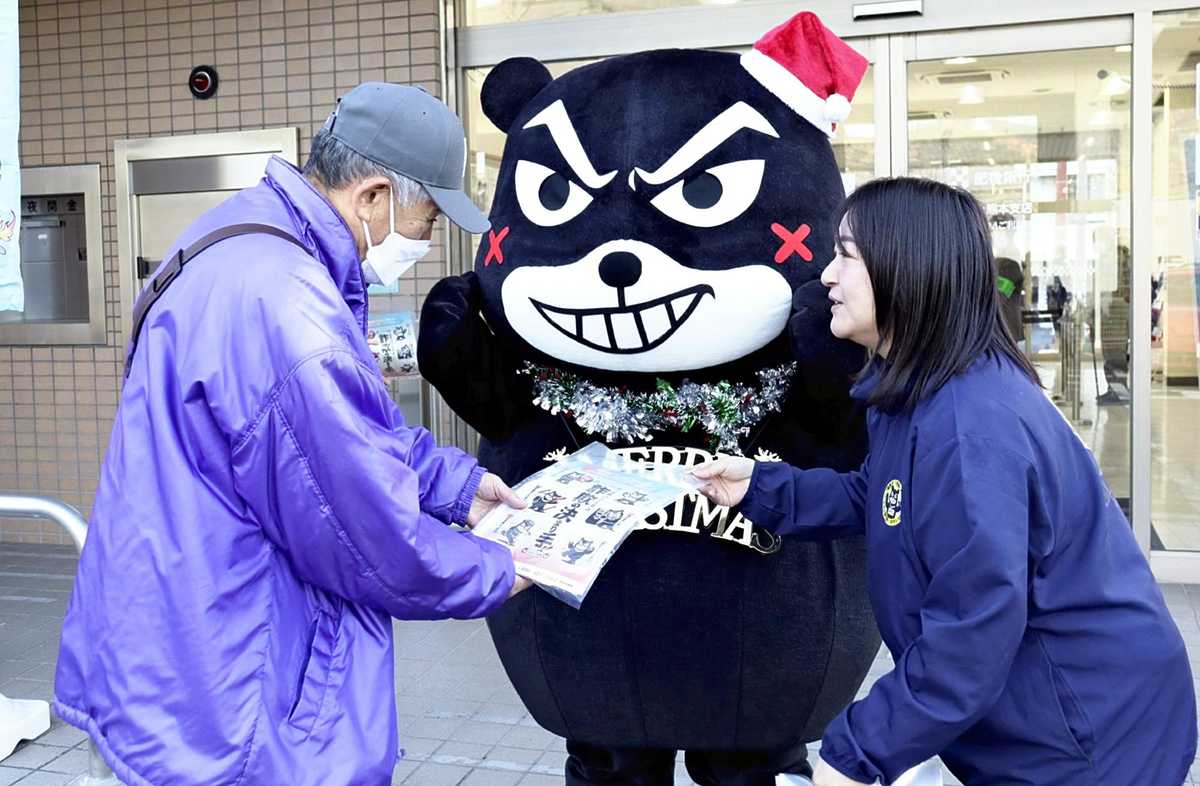 Warumon also helps to raise awareness about fraud other ways. On Dec. 15, Warumon handed out pouches and flyers at an event at Higo Bank’s Kami-Kumamoto branch in the city with the message of hanging up the phone if the person on the other end begins talking about money.