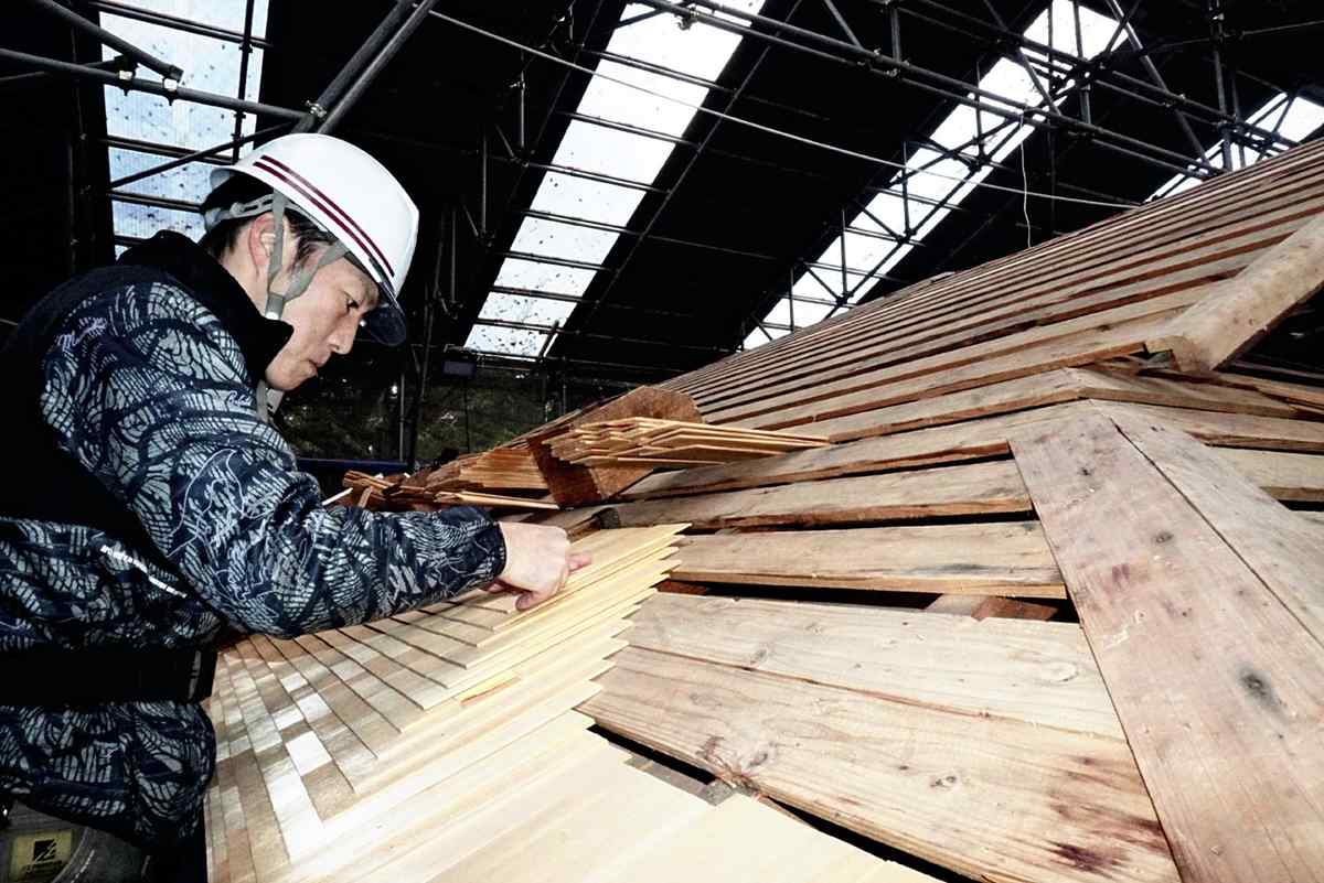 After removing the sawara boards, which were made brittle by moss growth and bird damage, workers began layering on about 50,000 boards in November. Each board is about 30 centimeters long, about 6 centimeters to 9 centimeters wide and about 3 millimeters thick.