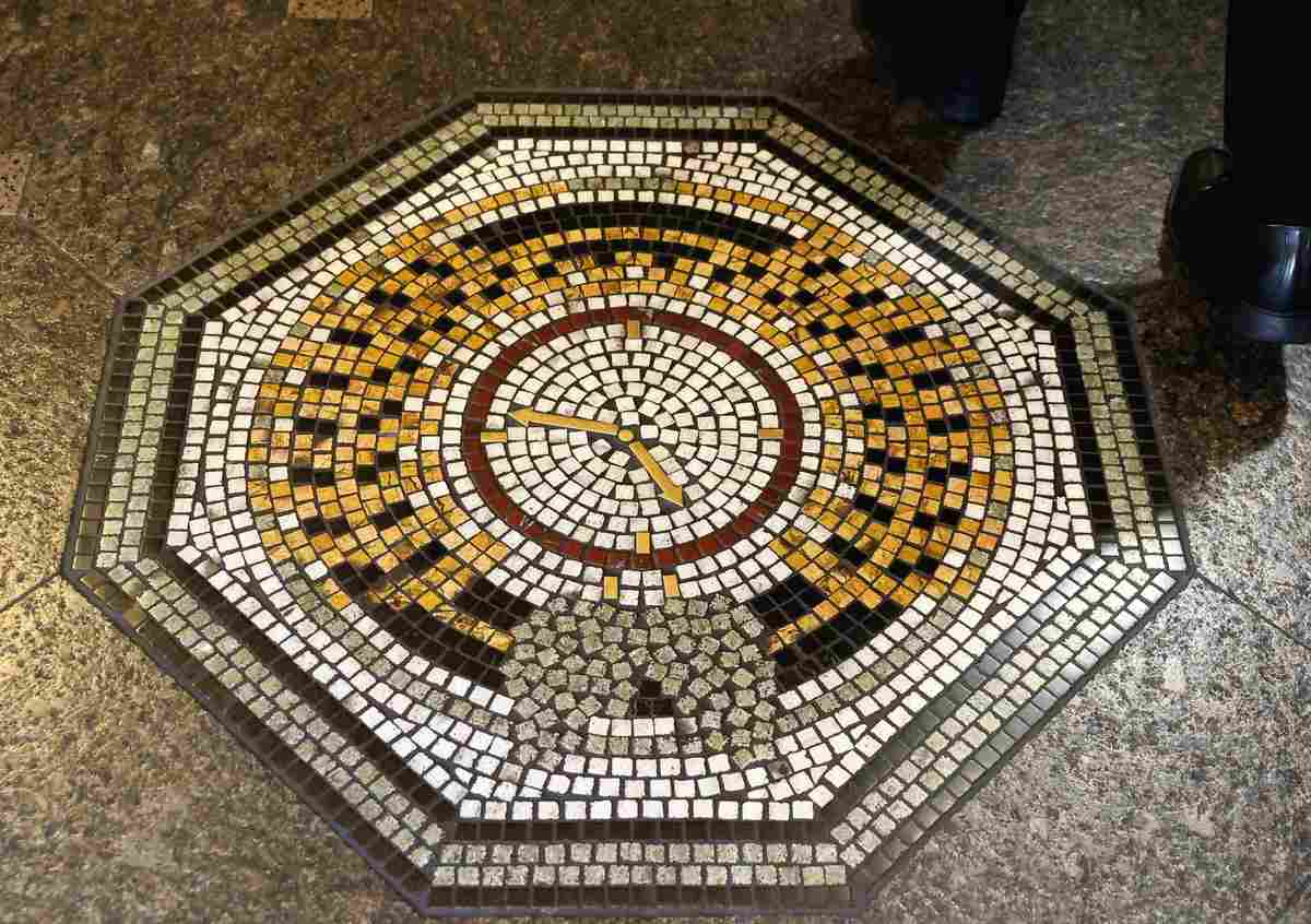 A clock showing 5:46 is featured on the floor at the restaurant’s entrance.