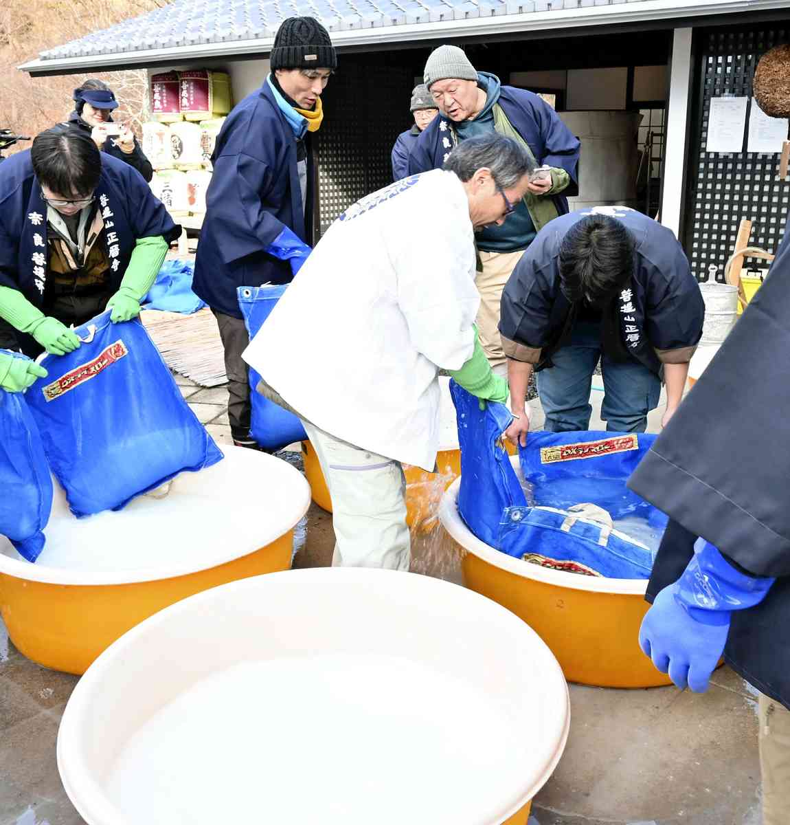 On Jan. 6, about 15 employees from seven sake breweries in the prefecture began the work under a cold sky. They washed about 370 kilograms of rice produced in the prefecture with spring water from the temple grounds and added lactic acid bacteria discovered at the temple and yeast in a large tank. They mixed these ingredients to create the fermented liquid used in sake brewing.