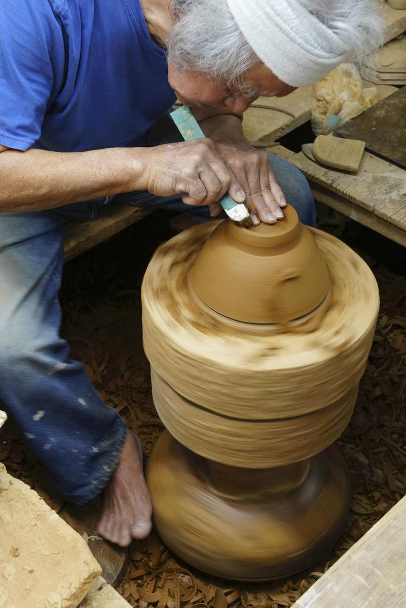 Shimabukuro spins a potter’s wheel with his foot and carves a ware.