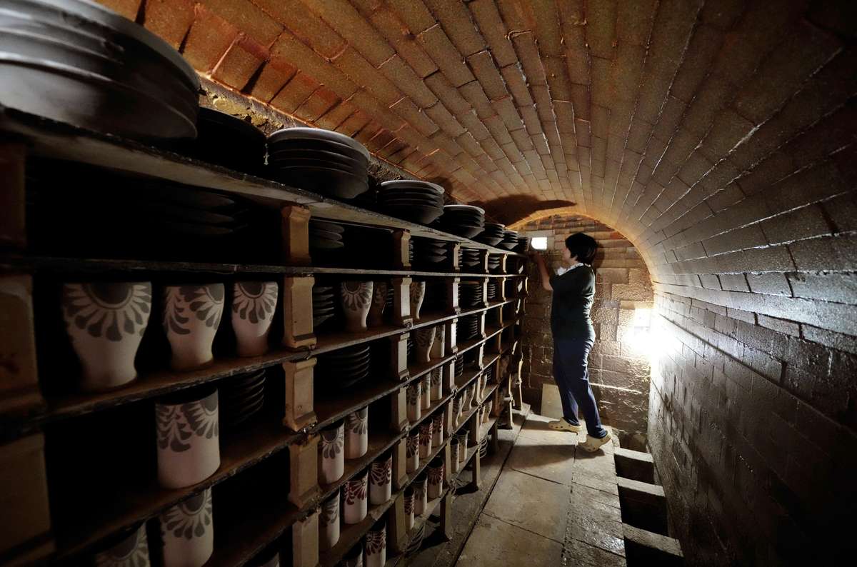 A potter places plates and other wares in the kiln chamber.