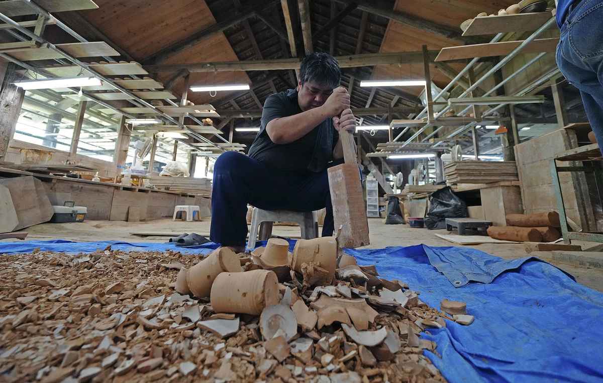 In early September, potters at Tsunehide Studio were destroying wares that had failed during production before going into the kiln.