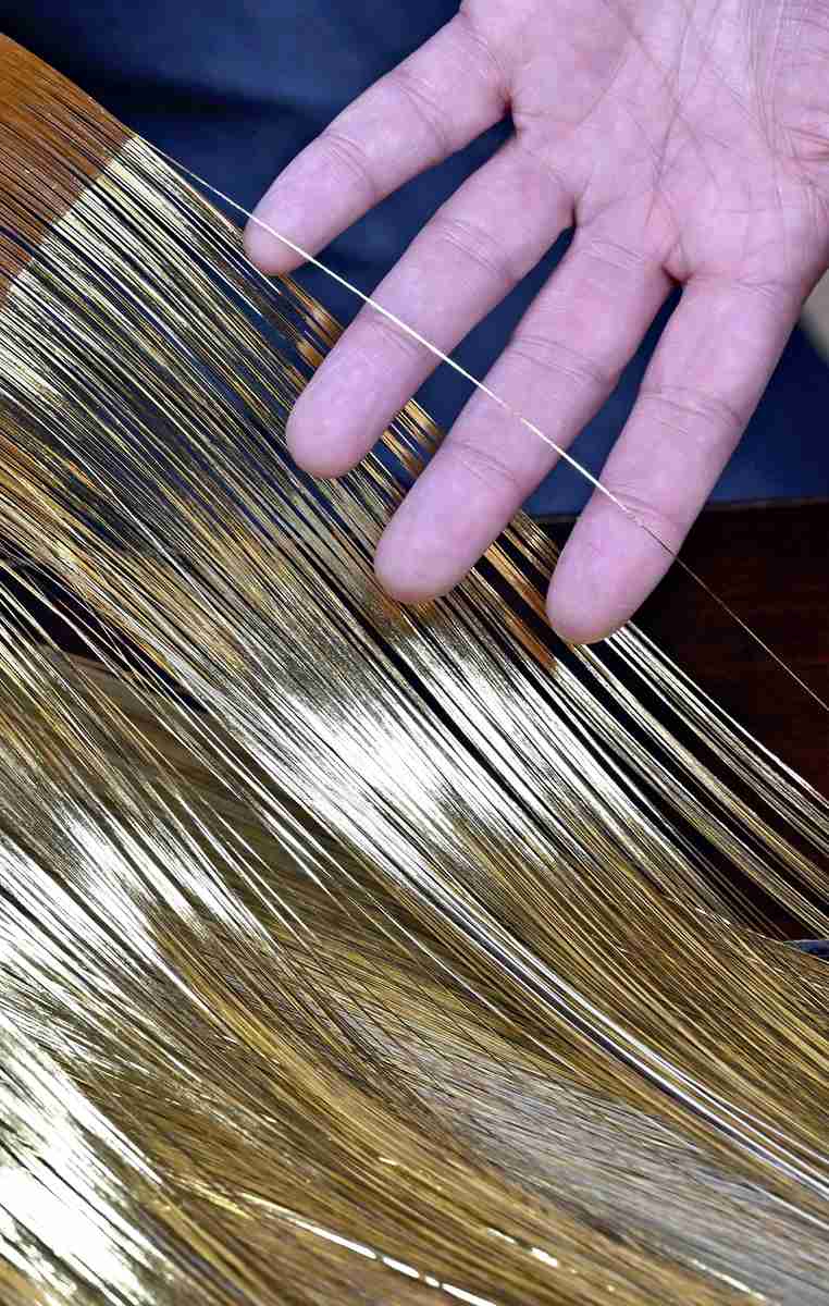 Hikibaku threads are made with gold foil adhered to washi paper and cut thinly. High purity gold is used.