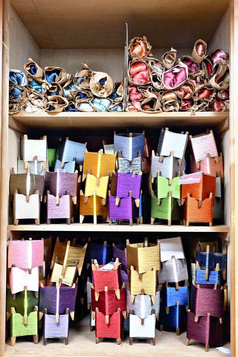 Spools of silk thread in various colors are kept on the shelves.