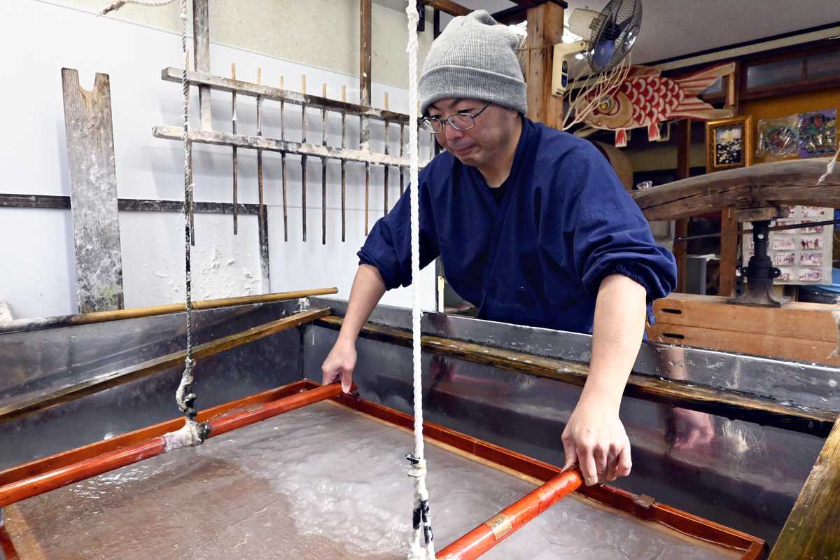 A worker makes traditional washi paper at Otake Tesuki Washi no Sato.