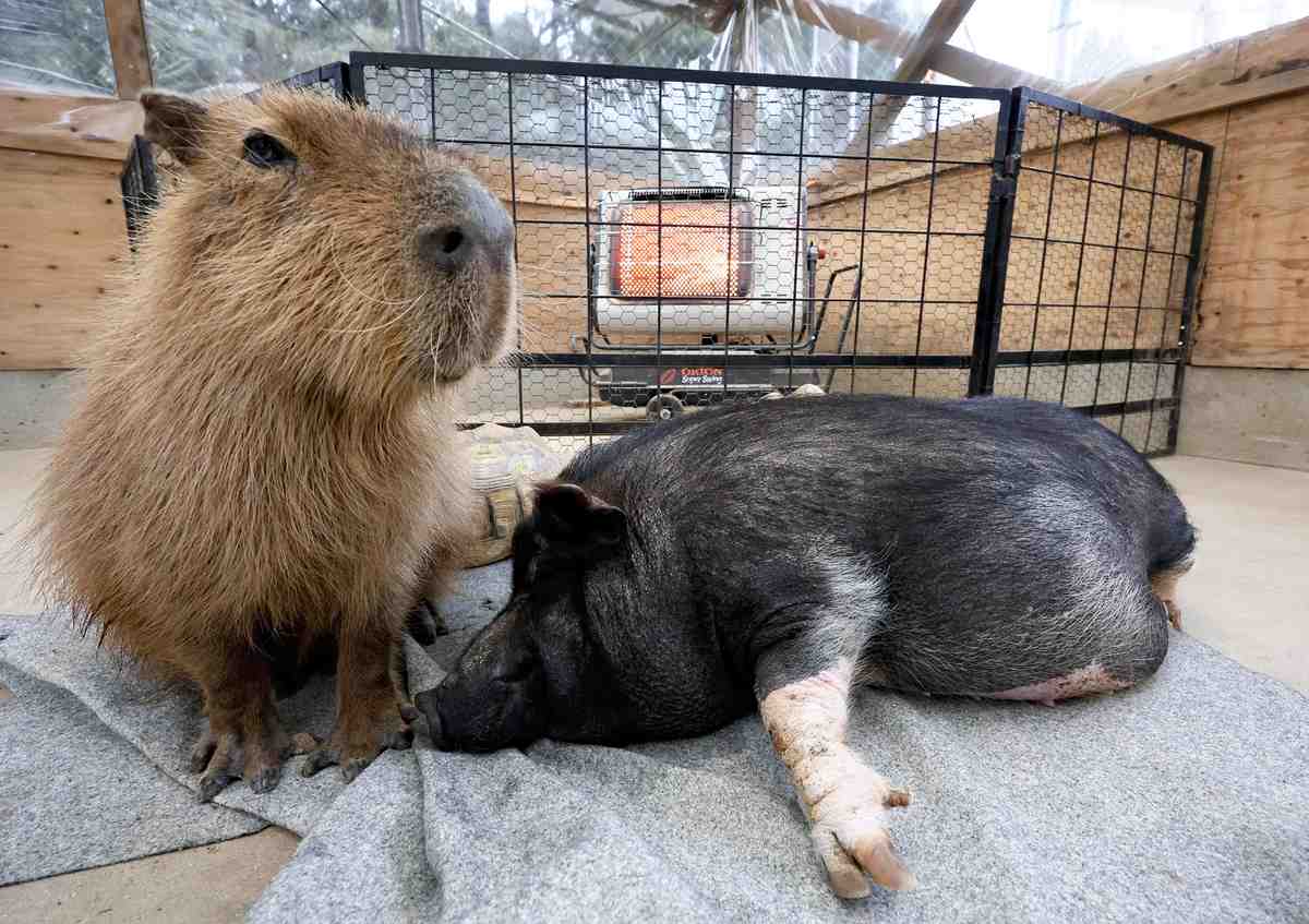 A capybara, left, and a mini-pig warm themselves in front of a heater on Feb. 2.