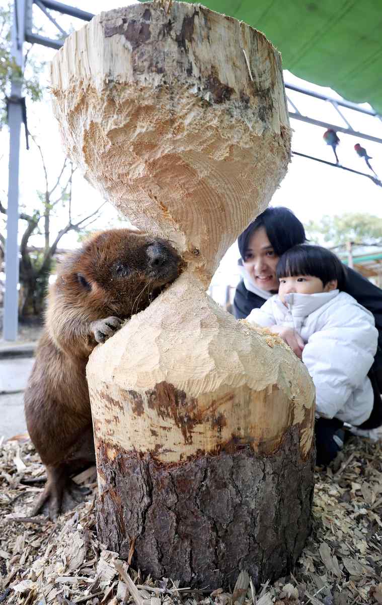 HISAYAMA, Fukuoka — Beavers gnawing on logs can be observed up close at the Torius Friendly Zoo in Hisayama, Fukuoka Prefecture.