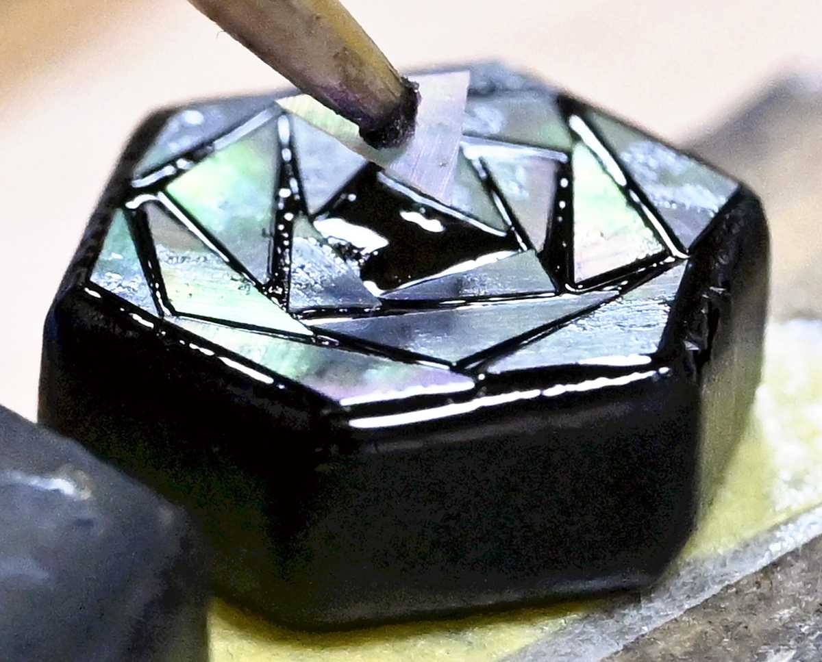 Nomura attaches small pieces of shell to a hexagonal base about 1 centimeter in diameter using lacquer as an adhesive.