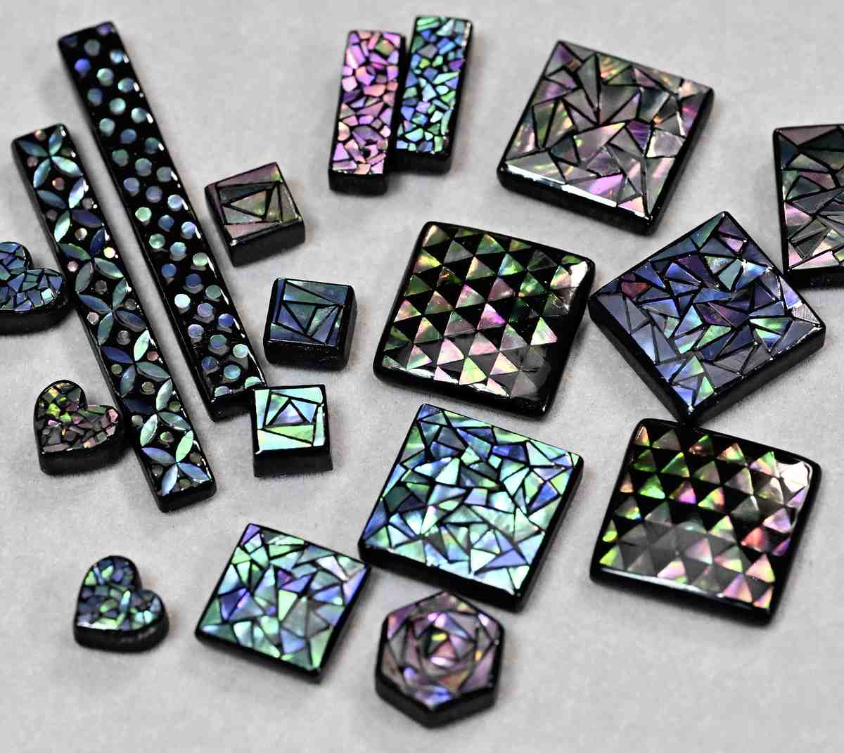 Nomura’s finished raden works, which will be made into earrings or necklaces