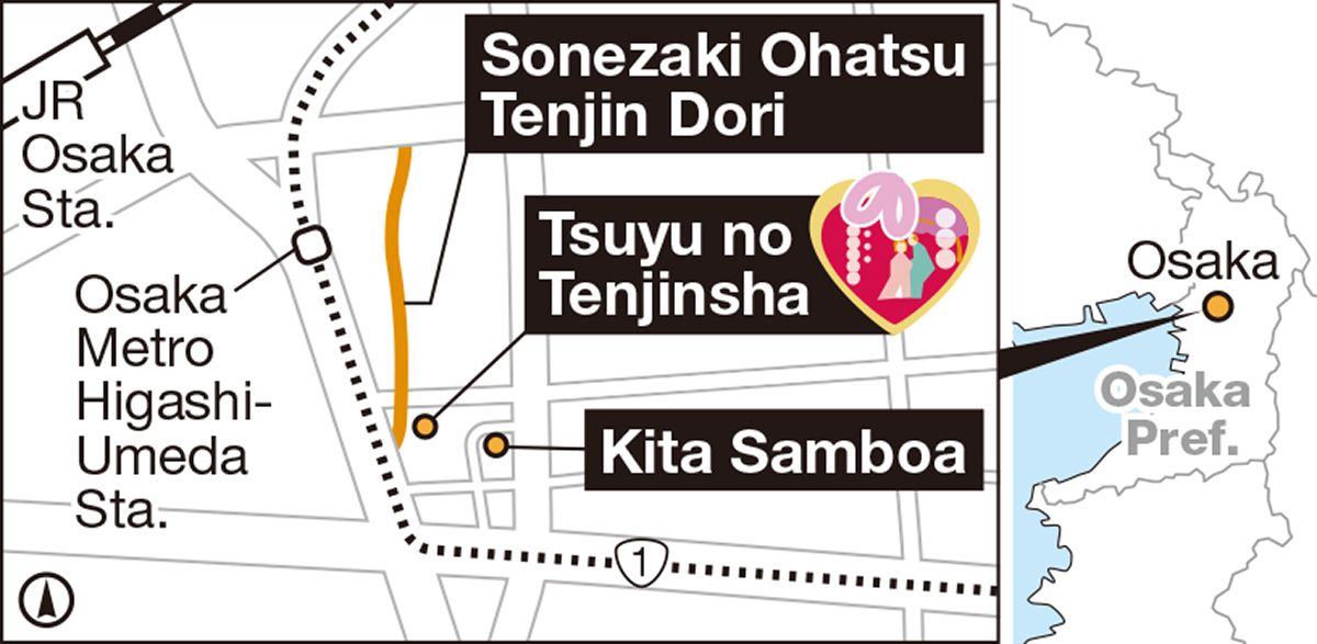 OSAKA — Located near JR Osaka Station, surrounded by high-rise buildings and restaurants, Tsuyu no Tenjinsha shrine is known as the setting for a tragic love story from the 18th century.