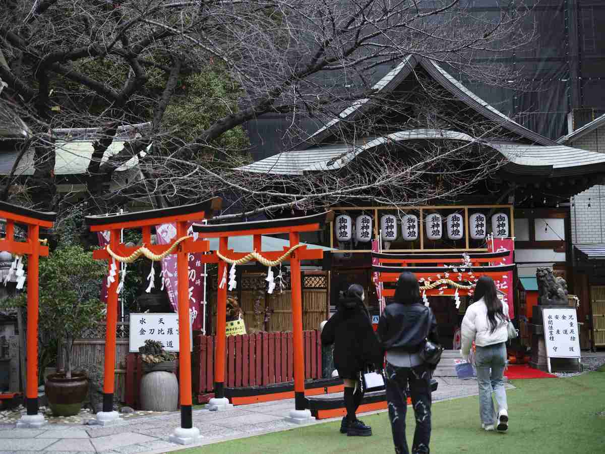 Visitors are seen at Tsuyu no Tenjinsha shrine in Kita Ward, Osaka.