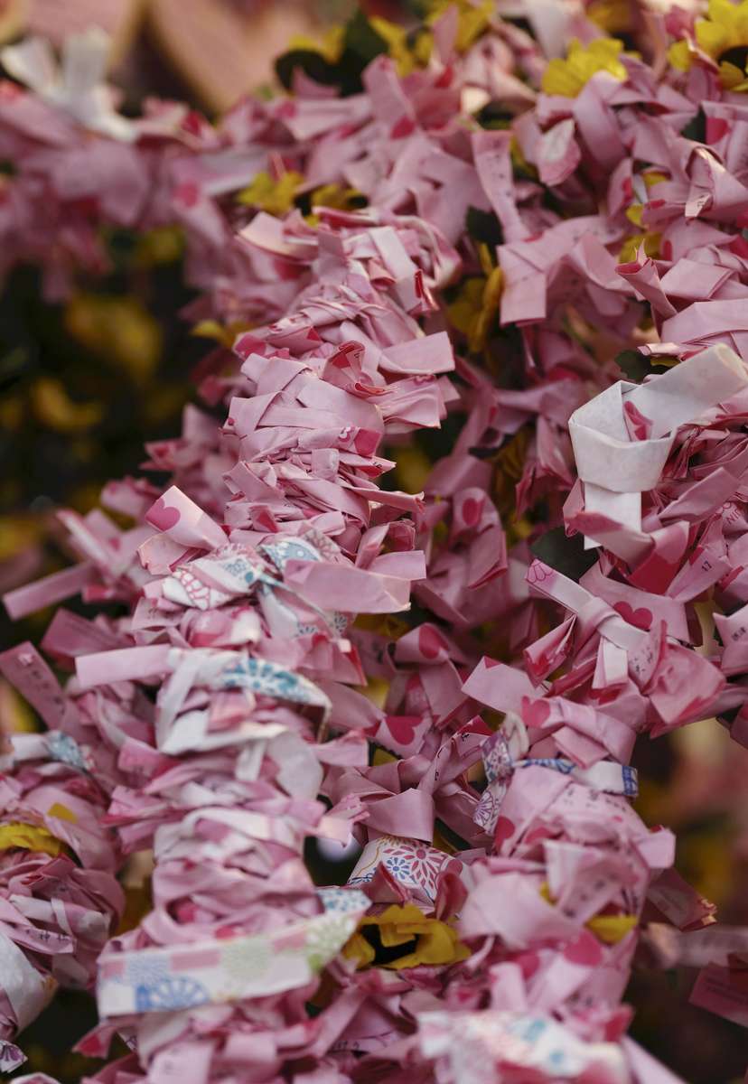 Love fortunes are seen at Tsuyu no Tenjinsha shrine.