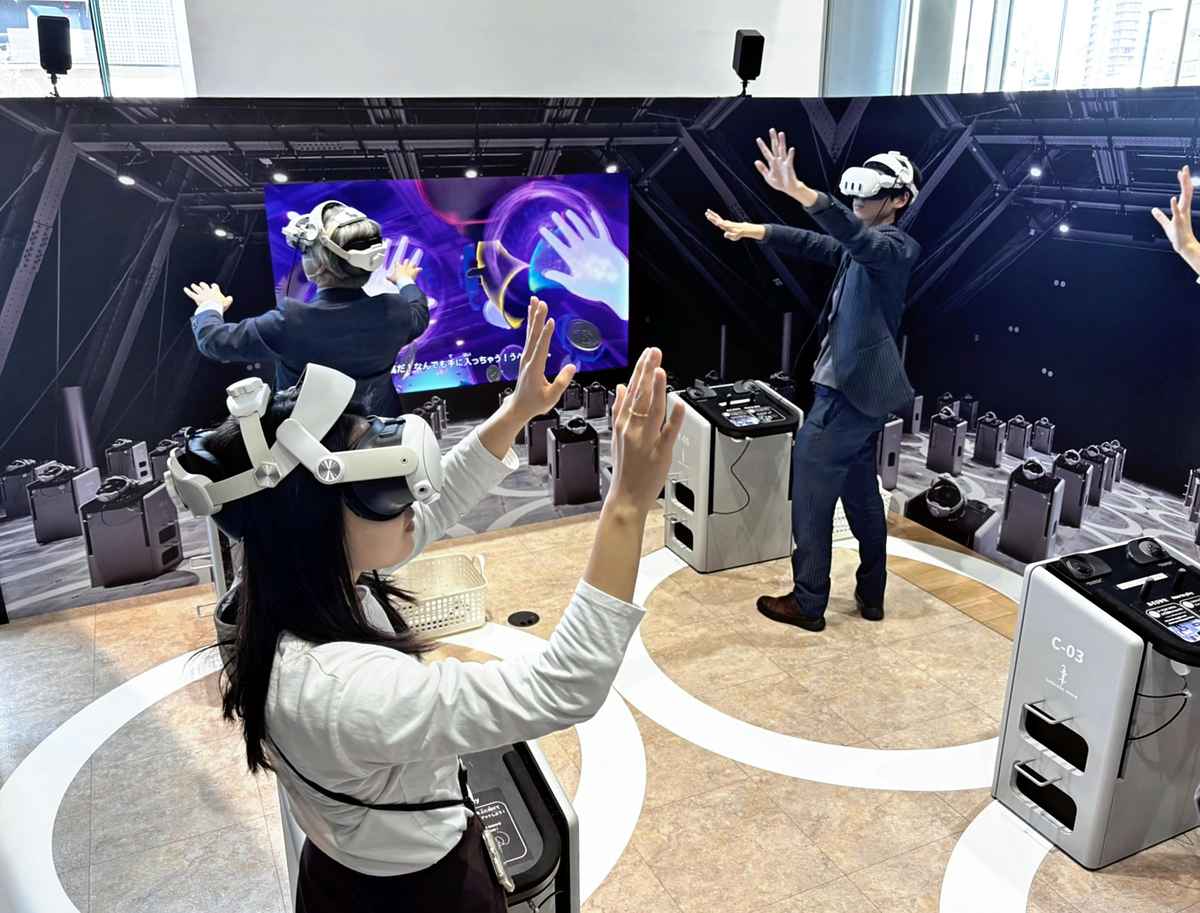 Participants wear XR goggles at the Gas Pavilion Obake Wonderland in Nishi Ward, Osaka.